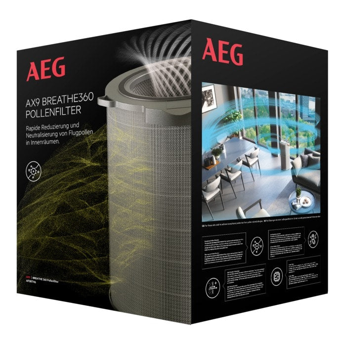 AX9 360 Filter enthalten ein einzigartiges vorgeladenes Filtermedium, das eine hochwirksame Barriere gegen mikroskopische Partikel bildet und 99,5 % der bis zu 0,3 Mikrometer kleinen Reizmittel einfängt. Der zylindrische Filter verfügt über eine enorme Oberfläche, wodurch die Kapazität größer und die Lebensdauer länger ist, und liefert eine sehr hohe Luftzirkulation.